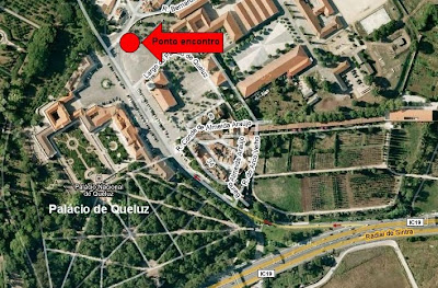O ponto de encontro é junto ao Palácio Nacional de Queluz, na esquina do passeio assinalado no mapa, às 9:20h.