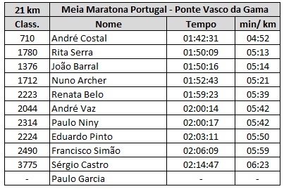 Meia Maratona Portugal - Ponte Vasco da Gama (21 km) - Tempos